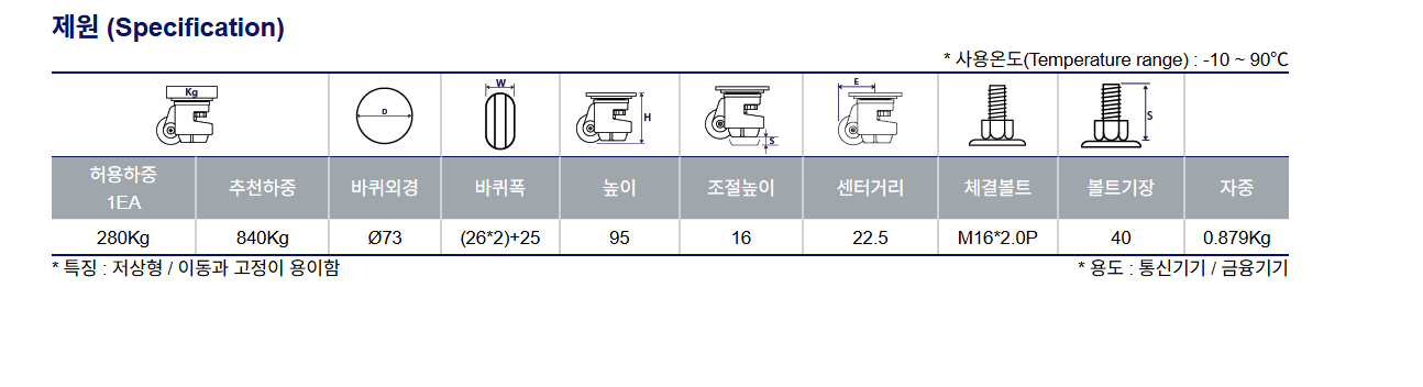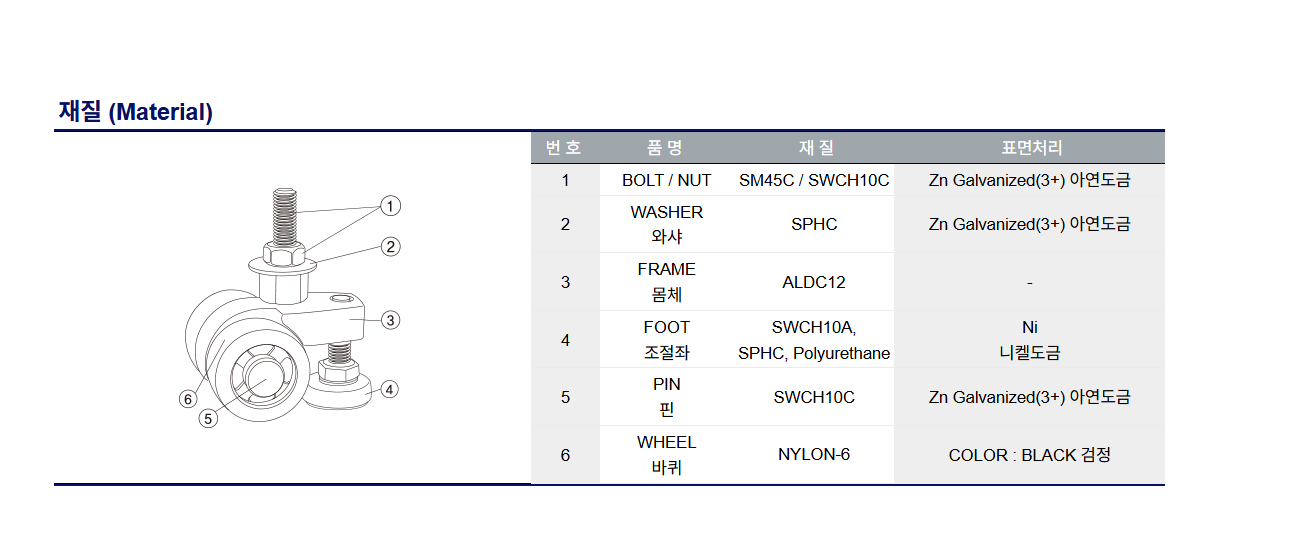 제품소개 제품소개 ADJUST LEVELER Download(2D/3D) WCT-800S #RoHS #REACH 소재Material 몸체 : 알루미늄 다이캐스팅(ADC12) 표면처리Finish 몸체 : 아연도금 제품설명ProductInfo 특징 저상형 이동과 고정이 용이함 용도 통신기기, 금융기기 제품 세부 정보